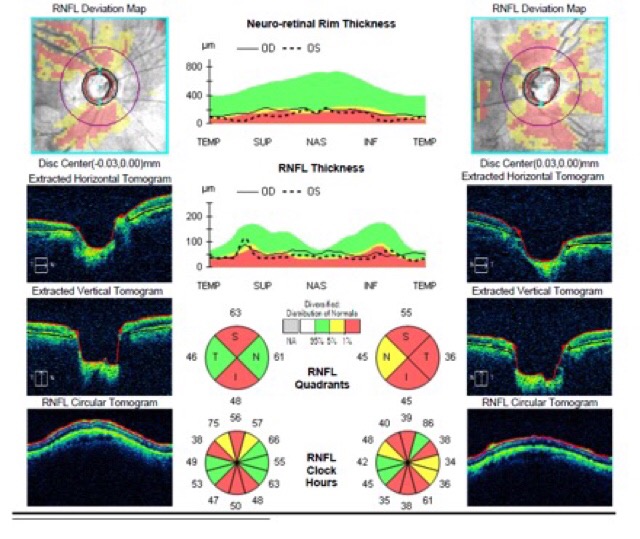 How is open angle glaucoma diagnosed? When patients present to an Ophthalmologist, a detailed history and physical examination is performed. Intraocular pressure is measured- usually raised beyond 21mmHg in the case of open angle glaucoma. Signs that point to the disease- a characteristic weak, thinned-out appearance of the optic nerve, would make one suspicious of the disease. The disease is often confirmed on further testing, where both structure and function of the nerve is tested. High resolution Optical Coherence Tomography (OCT) scans of the optic disc and the surrounding nerve fibre layer can determine if there is any thinning of the nerve due to glaucoma, and Humphrey Visual Field (HVF) testing can map out areas of visual field loss.